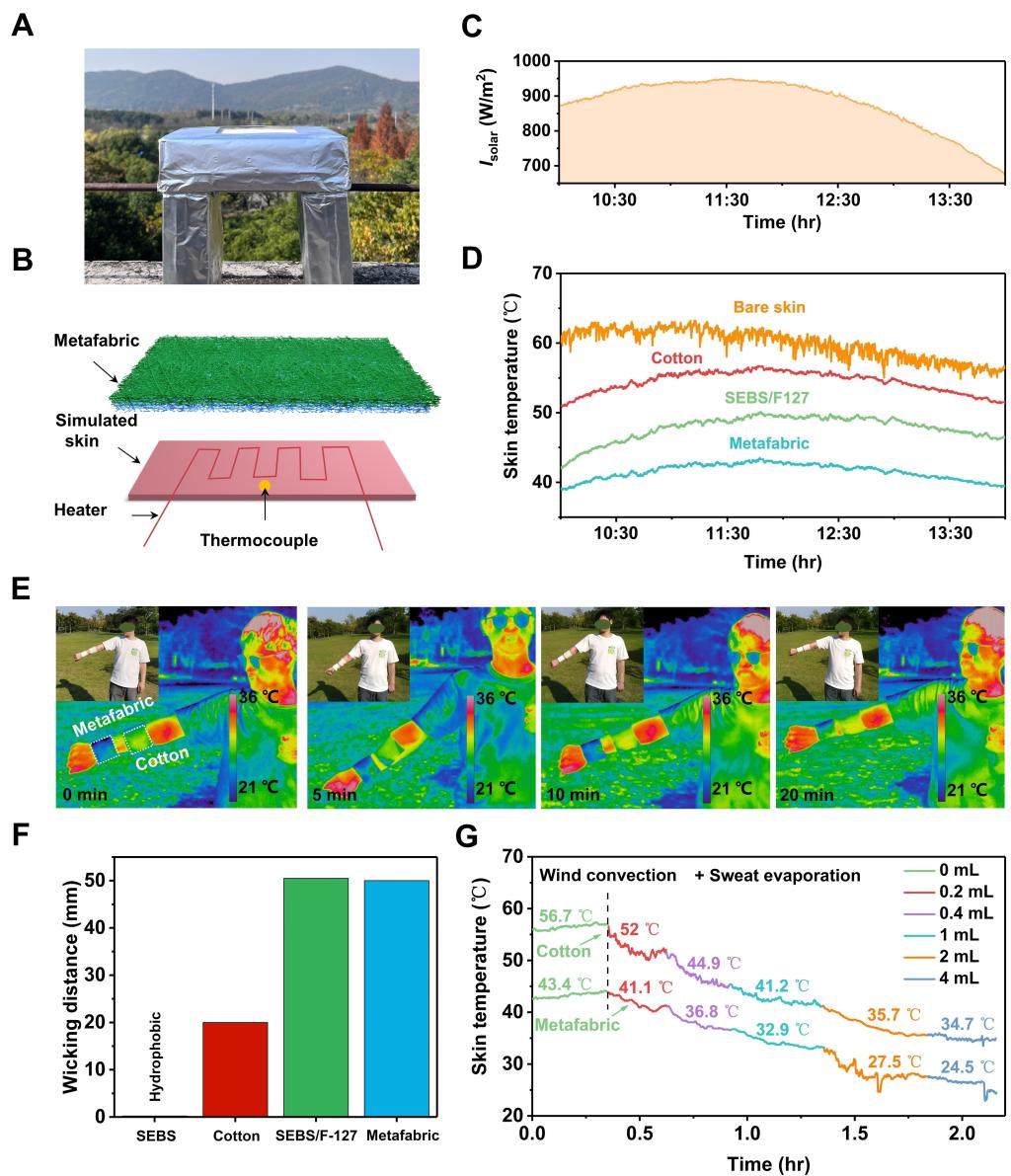 3.将生物相容性F127聚合物和高折射率(n≈1.8)Al2O3光散射体集成到SEBS织物上时,该层级结构超织物具有很高的光谱选择性。在晴天(~6.5oC)和阴天(~4.5oC)都能实现优异的亚环境温度冷却。F127的加入一方面增强了热辐射发射率;另一方面,它在定向输送汗液中起关键作用。具有高太阳反射率的Al2O3纳米颗粒同时提供了一个粗糙的微纳米纤维表面,促进汗水蒸发,实现“一石二鸟”的功能。