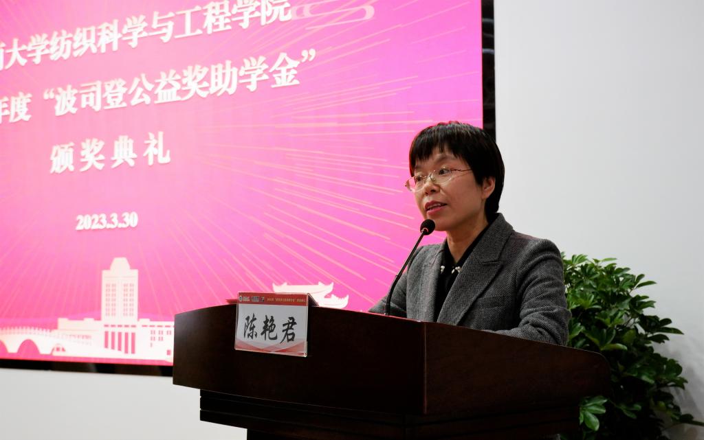 教育事业的发展和纺织服装行业人才的培养表示衷心的感谢,对获奖同学表示祝贺。同时,陈书记也提出了三点期望:第一、明心知往,力行求至;第二、明德敏学,穷高极远;第三、明理善思,责有攸归。陈书记希望同学们将这份爱心与责任传递下去,秉承“博学慎独,经纶天下”的院训,弘扬波司登“温暖全世界”的情怀,让理想成为新时代征程的航灯,让奋斗成为洋流中的基石,让自己成为青春路上的掌舵人!