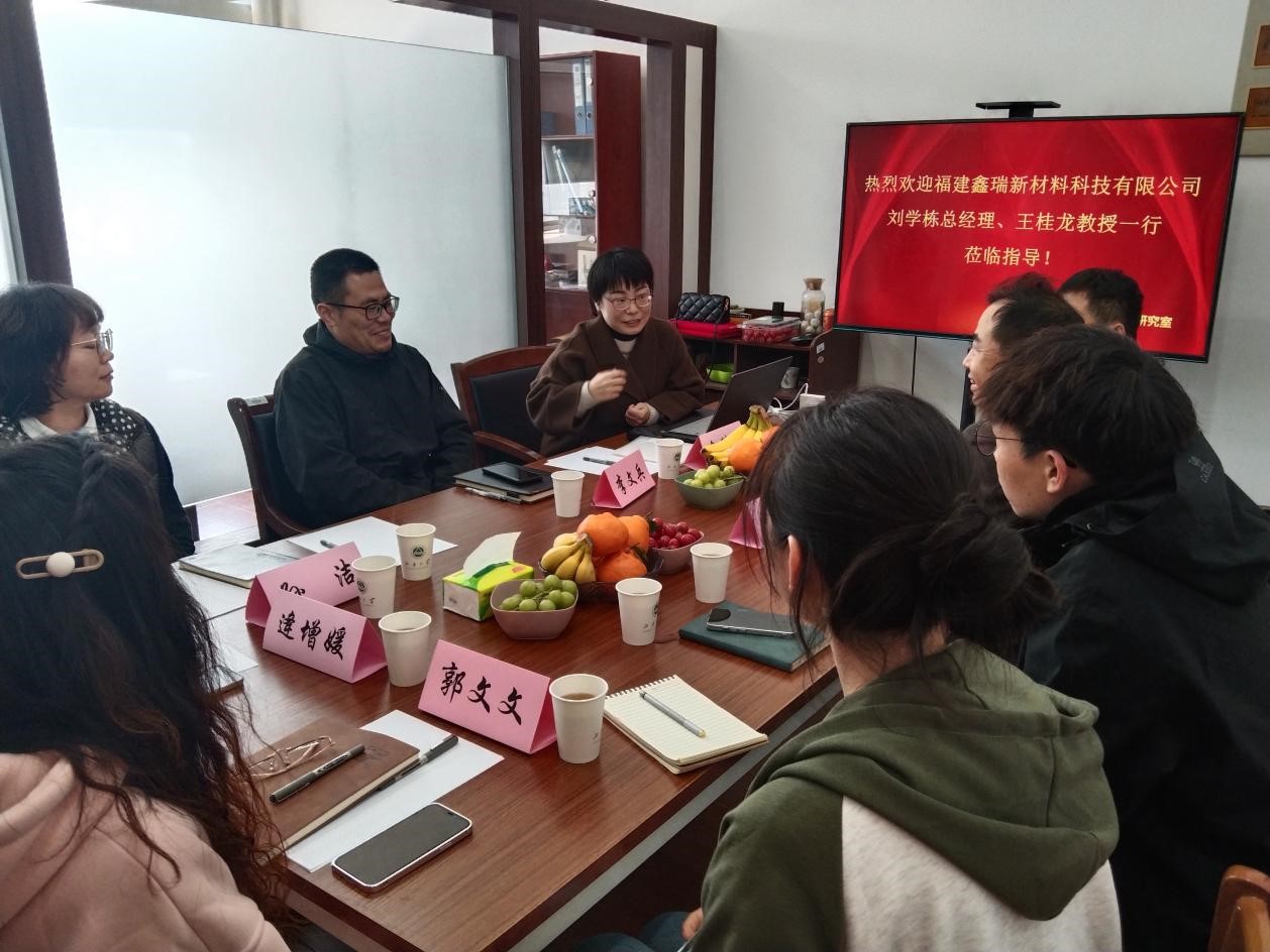 俞科静对刘学栋总经理、王桂龙教授一行的到来表示热烈的欢迎,并对产业用纺织品研究室基本情况、科研团队及主要研究方向进行了详细介绍。福建鑫瑞总经理刘学栋对公司的发展历史、企业概况、合作项目需求等做了介绍。与会双方就泡沫发泡工艺等进行了深入交流,明确了合作方向。