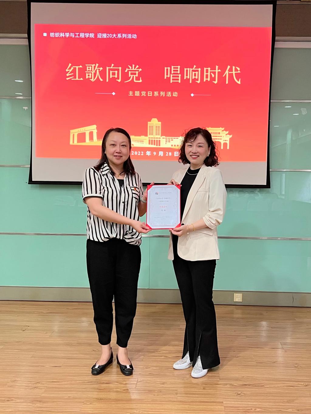 会后,由学院张菁书记及陈艳君副书记代表学院党委为钱老师颁发了证书。本次活动通过讲座与音乐相结合的全新方式来呈现中国共产党建党百年以来的建设历程和丰功伟绩,给师生党员上了一堂生动的文艺党课。