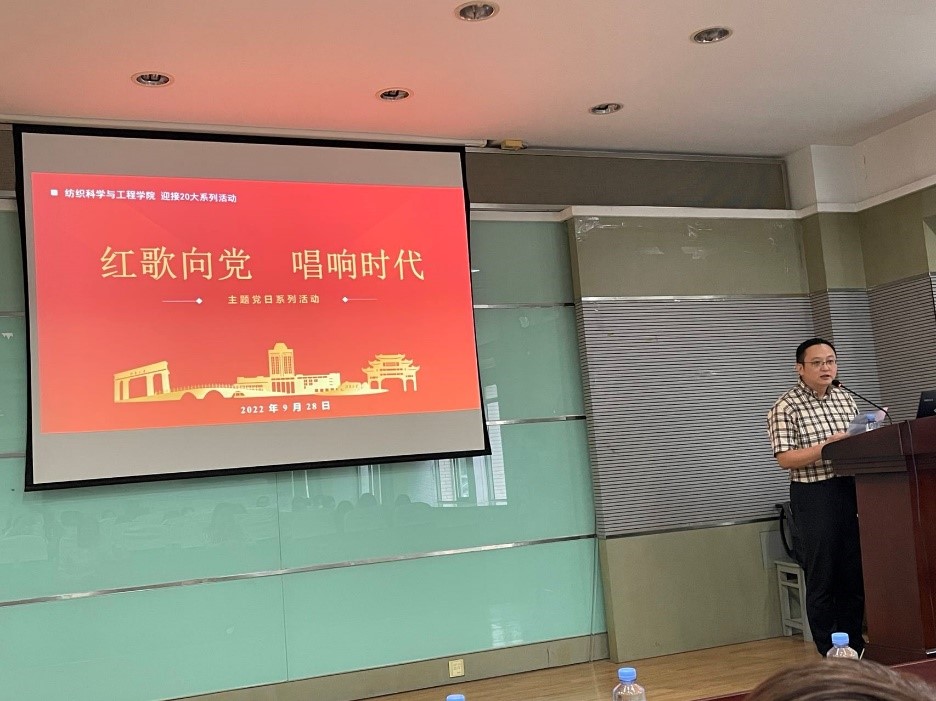 轻化系党支部及学生党支部在学院A103会议室举办了“红歌向党,唱响时代”的主题党日活动,邀请了我校人文学院钱琳副教授作专题报告,学院张菁书记、陈艳君副书记列席活动。主题党日活动由轻化系教师党支部书记张丹教授主持,学院40余名师生参会。