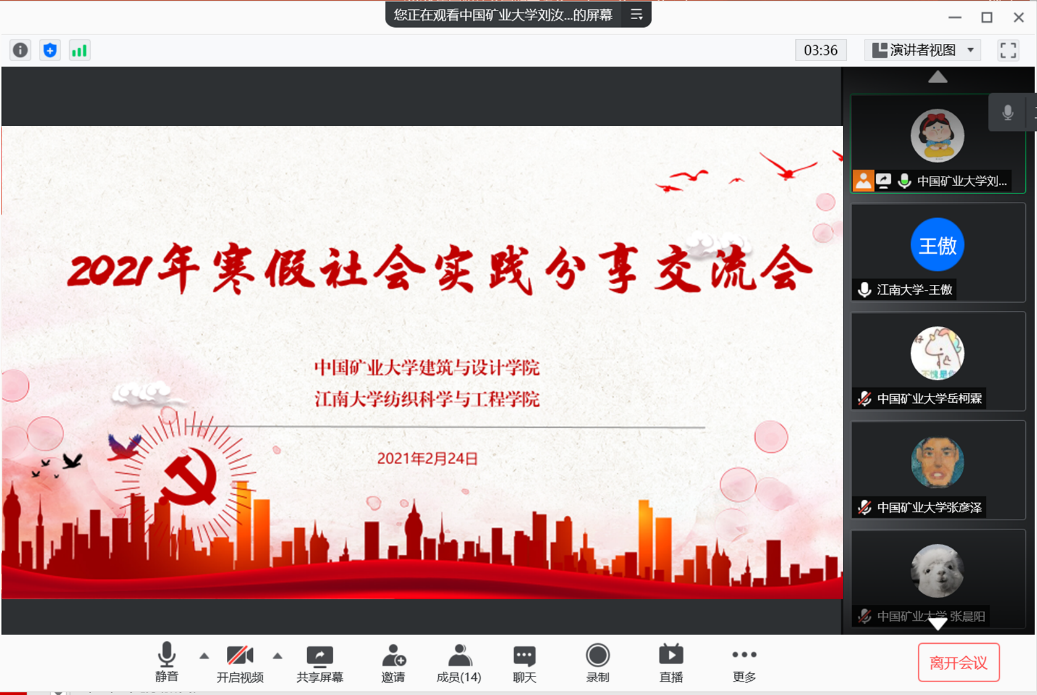 2月24日,实践团队与中国矿业大学建筑与设计学院“追寻革命足迹·感悟使命初心”社会实践团队的线上交流会顺利举行,两支团队的实践队员们以自身经历分享实践过程中的所见所悟、所思所想,讲述成长故事、传递青春正能量。