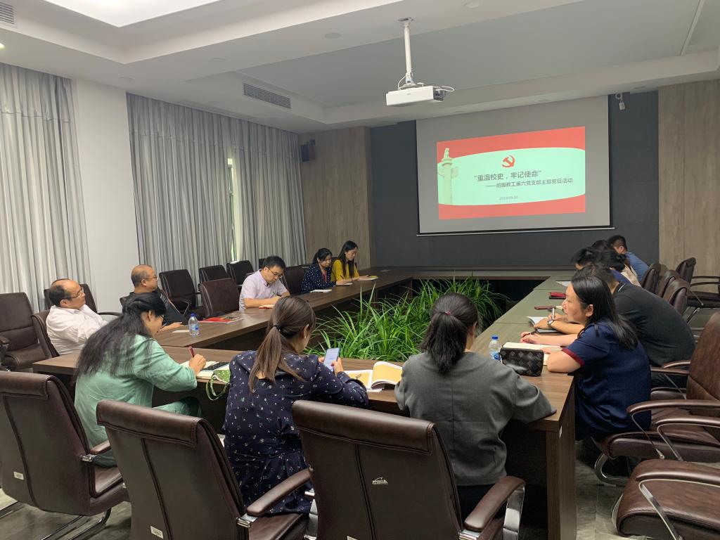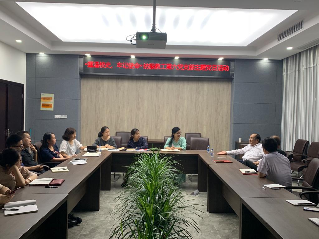 2019年9月30日,纺织服装学院教工第六党支部“重温校史,不忘初心”主题党日活动在纺服B101会议室顺利召开,纺服教工第六党支部全体党员参加了党日活动,活动还邀请了教工第五党支部部分党员列席本次活动。