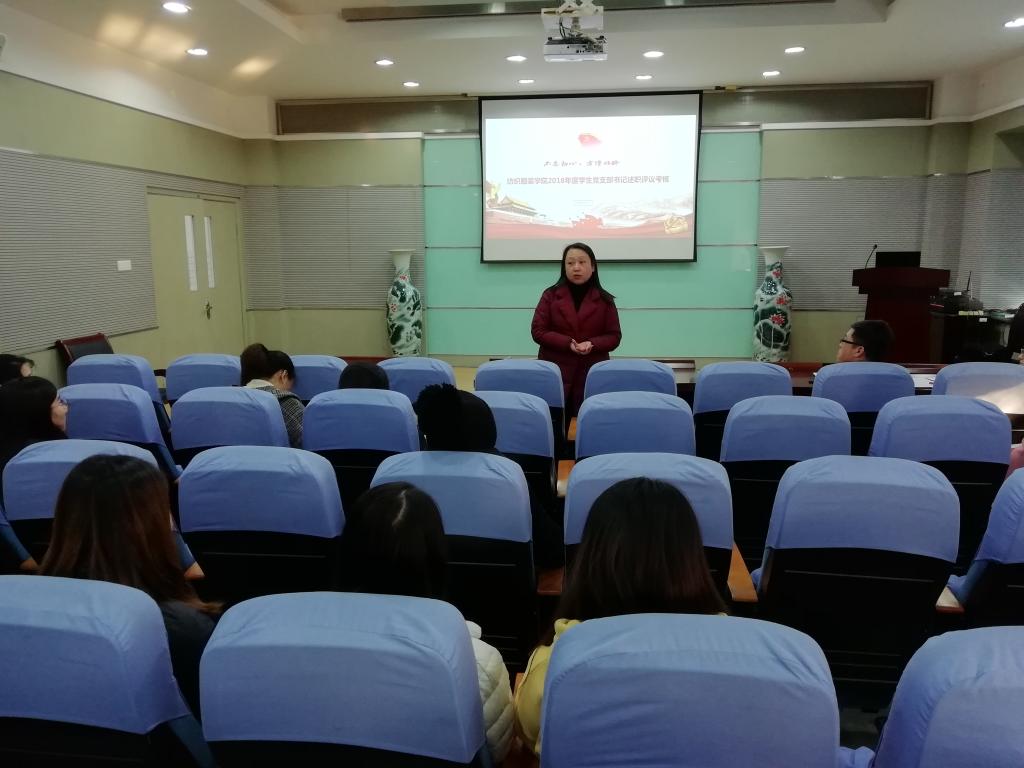 为增强“四个意识”、落实管党治党政治责任,严肃党内政治生活、推动全面从严治党向基层延伸,压实学生支部书记主体责任、增强工作实效,按照校党委统一部署,1212日下午,纺织服装学院党委在学院楼A103会议室召开2018年学生党支部书记述职评议大会。院党委委员,全体辅导员,学生支部书记、支部委员参加了此次述职评议大会。会议由辅导员吴丹主持。