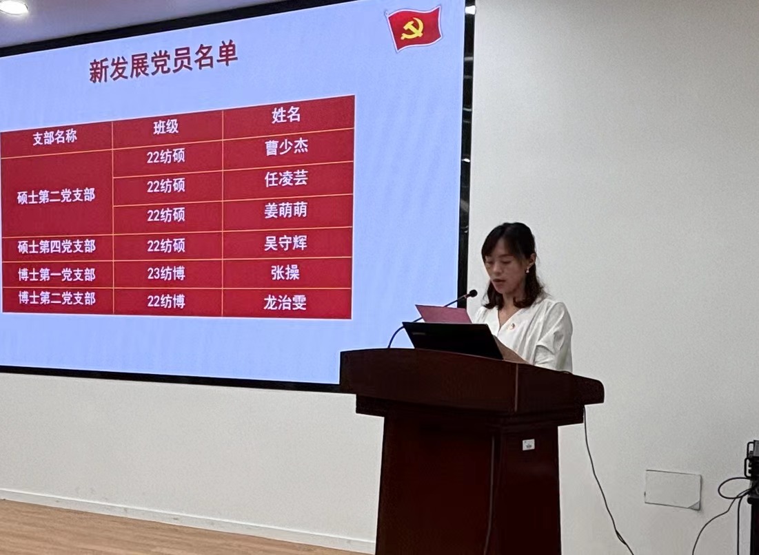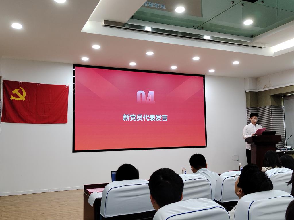 纺织2104班李英荟同志代表新党员发言。他表示,作为新时代的青年党员,一要强化党性修养,永葆赤诚忠心的韧劲;二要发挥先锋作用,铆足奉献小我的干劲;三要锻造过硬本领,鼓足笃学尚行的拼劲,以实际行动践行党员的职责与使命。