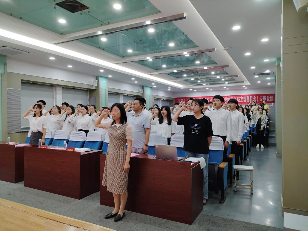 在A103会议室举行“七一”入党宣誓仪式暨专题党课。学院党委副书记、副院长杨莉勤,专职组织员张志新,研究生辅导员伍胤鸿,学生党员代表以及全体中共预备党员参加活动。活动由研究生辅导员孙慧主持。