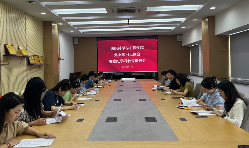 师生党支部书记就党纪学习教育、学院“学习习近平文化思想 探寻江南纺织精神”主题教育开展情况进行了交流。会议还就党支部意识形态工作、师德师风建设工作等进行了研讨,就学校近期印发的有关文件进行了传达和解读。