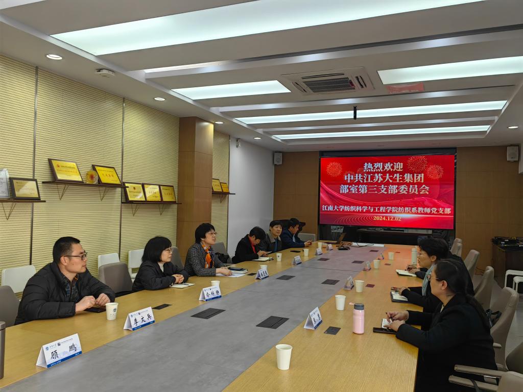 为了积极推动校企党组织共建、产学研对接、科技创新等方面的合作,12月2日,江苏大生集团部室第三党支部书记、创新管理中心主任、生产技术部副部长李兰女率队来院交流考察。学院党委书记张菁燕,纺织系教师党支部书记俞科静及支部相关教授参加了座谈交流。