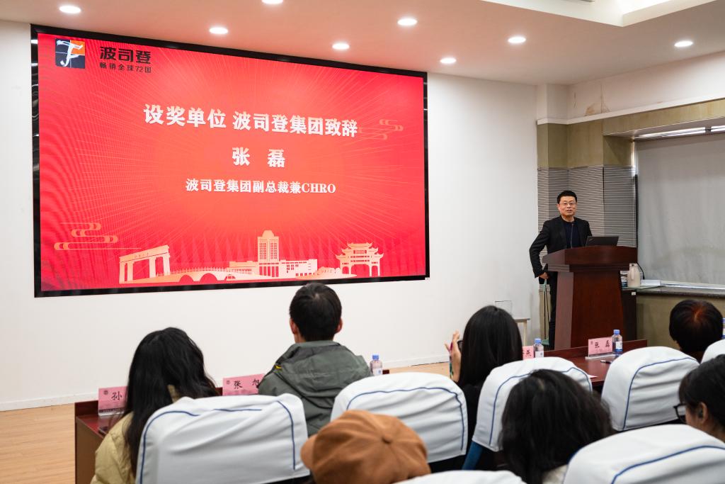 首先,张磊代表设奖单位致辞,他代表集团向长期以来关心、支持波司登集团发展的学校师生表示感谢,对获奖学生表示祝贺。他表示,波司登集团栉风沐雨48载,如今已发展成为中国的民族品牌,位列羽绒服行业首位,企业在发展的同时也始终秉持“温暖”的理念,积极回馈社会,助力众多学子勇攀高峰,奋进筑梦。他强调,江南学子是集团人才资产的重要组成部分,希望双方能继续携手,为社会培养出更多优秀的人才,共同推动行业的发展和社会的进步。