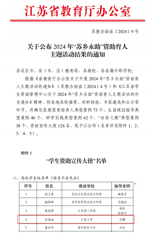 “苏乡永助”资助育人主题活动旨在宣传国家资助政策,提升资助育人实效,弘扬主旋律、传播正能量。2024年“苏乡永助”资助育人主题活动经各地各校推荐、材料核验、专家初选和终选,全省共确定高校学生组“资助宣传大使”60名。
