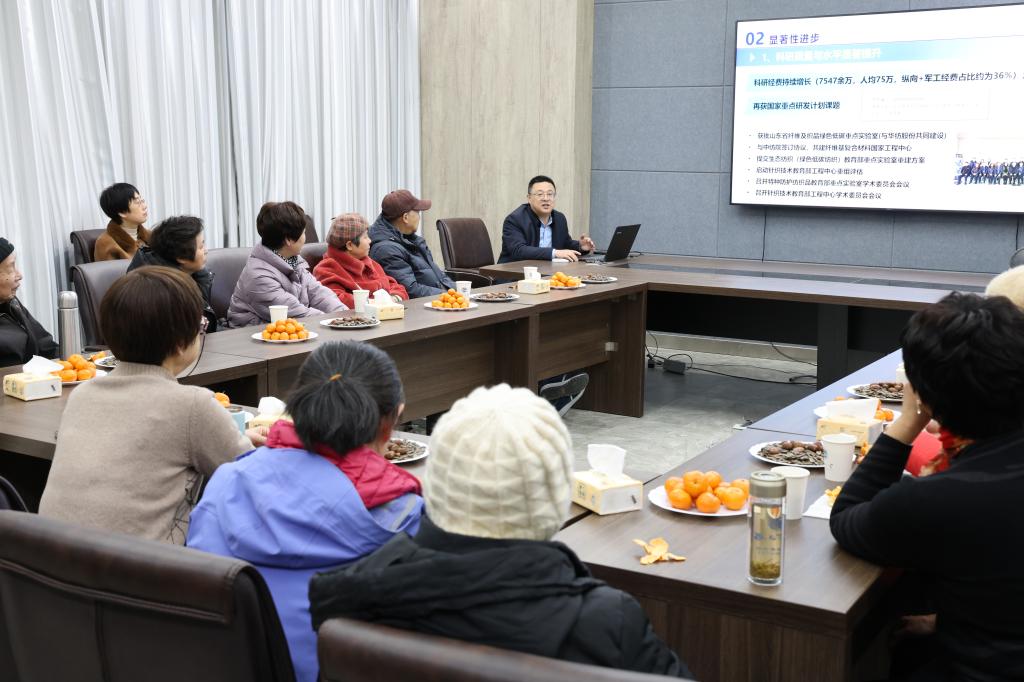 接着,付少海作学院工作汇报,他向大家汇报了一年来学院在学科建设、科学研究、人才培养、师资队伍、国际交流等方面取得的显著成绩。特别提到纺织工程学科在软科排名上连续两年蝉联世界第二,学院在国家自然科学基金项目、军工科研方向、教学成果奖中取得了新突破,还详细介绍了学院未来的发展规划。他强调,学院的发展离不开各位老同志躬身实干铸就的根基与贡献,希望退休老同志们继续关心、支持学院的发展,凝聚教育强大合力、共同书写崭新篇章。