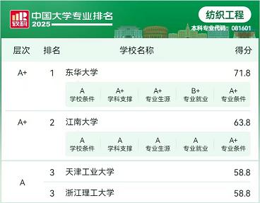 表现亮眼,纺织工程专业获评A+等级,位列全国第二;轻化工程专业获评A等级,排名全国第三,并在纺织类高校中高居榜首,再次彰显了该校在纺织与轻工领域的顶尖实力。