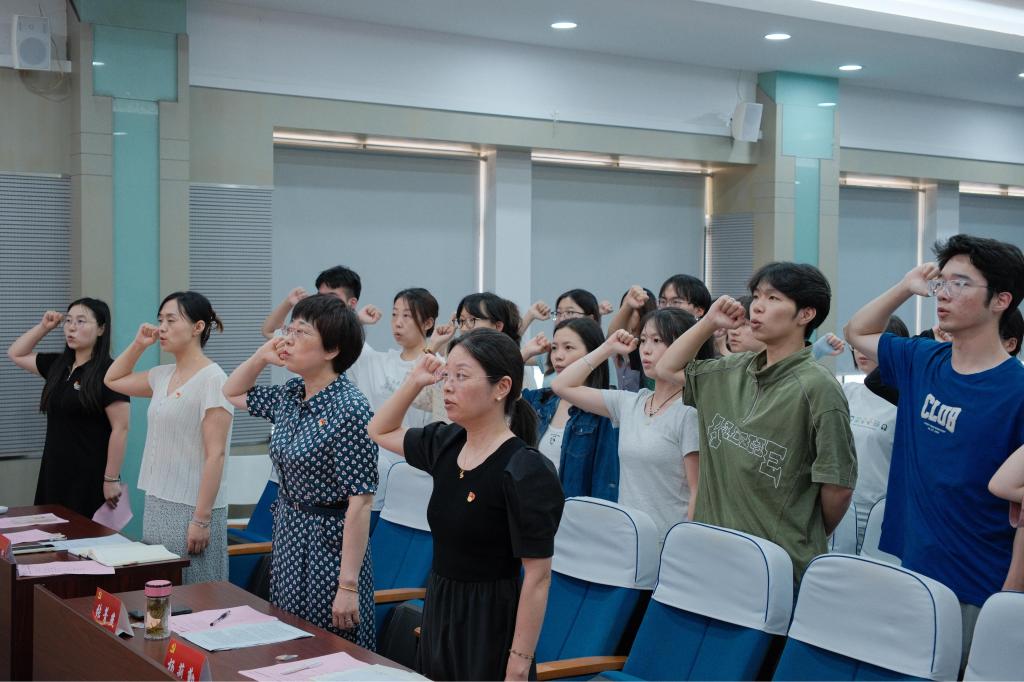 会议在庄严的《国际歌》中拉开帷幕。张志新宣读了2024-2025学年新发展党员名单。随后,面对鲜红的党旗,杨莉勤带领新发展党员一起高举右拳,庄严宣誓。“我志愿加入中国共产党……”铮铮誓言掷地有声,字字千钧激荡人心。党员同志们以铿锵有力的誓言表达对党的忠诚和为共产主义事业奋斗终生的决心。