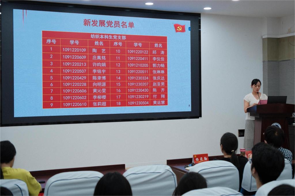 纺织2206班黄沁雯同志代表新生党员发言。她结合自身经历分享入党初心,并代表全体新发展党员庄严承诺:践行先锋使命,切实发挥“一名党员一面旗帜”的先锋模范作用,锤炼专业能力,掌握服务国家纺织产业发展的过硬本领,勇担时代重任,用实际行动书写“强国有我”的青春誓言。