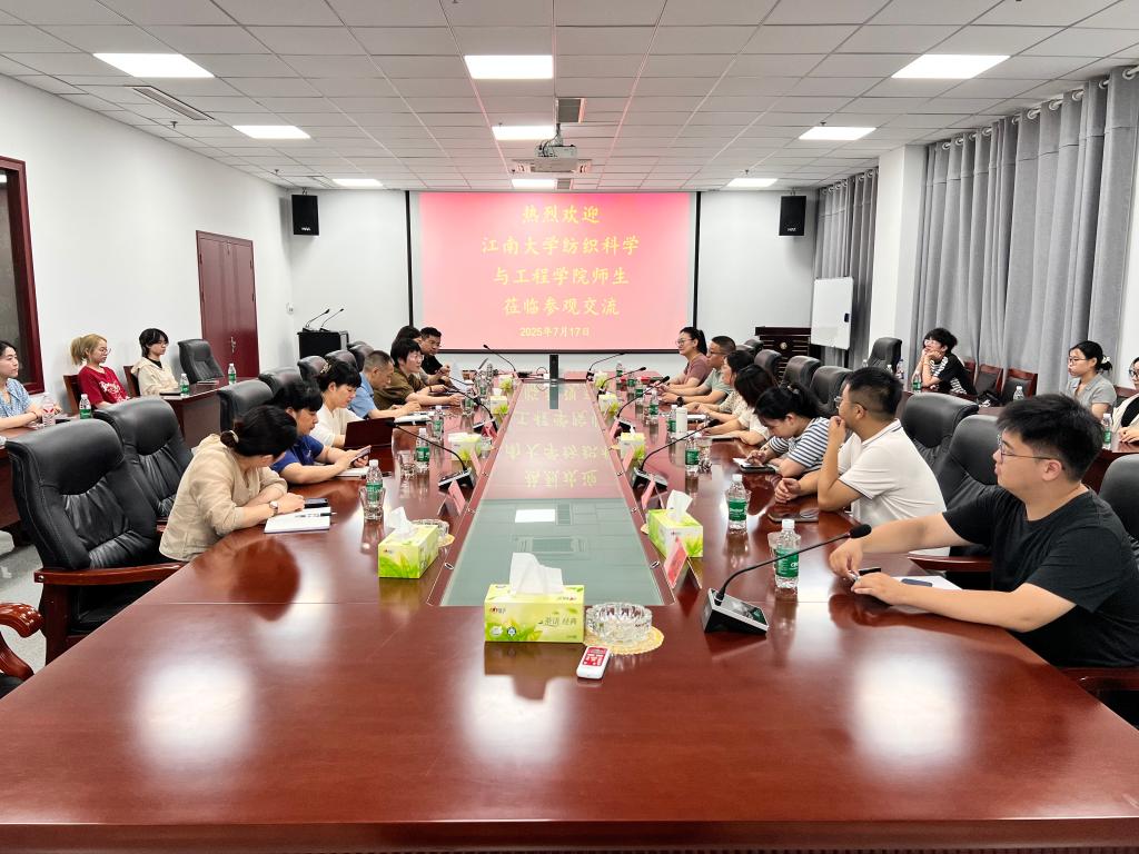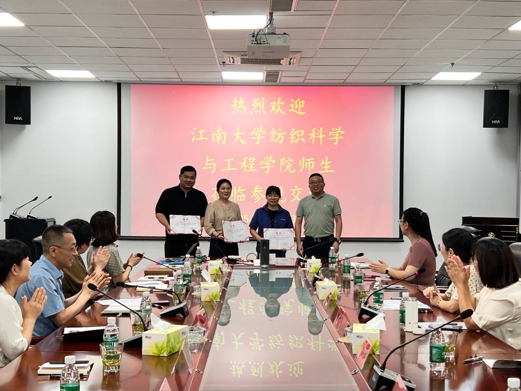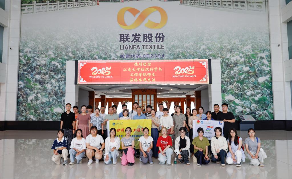 前往江苏联发纺织股份有限公司开展 “名企有约”走访调研暨暑期社会实践活动。学院党委副书记、副院长杨莉勤,副院长张丽平,轻化工程系主任殷允杰、副主任苏静,学工办主任任学敏,辅导员伍胤鸿、张旭、孙洲龙及22名本科生、研究生代表参加活动。