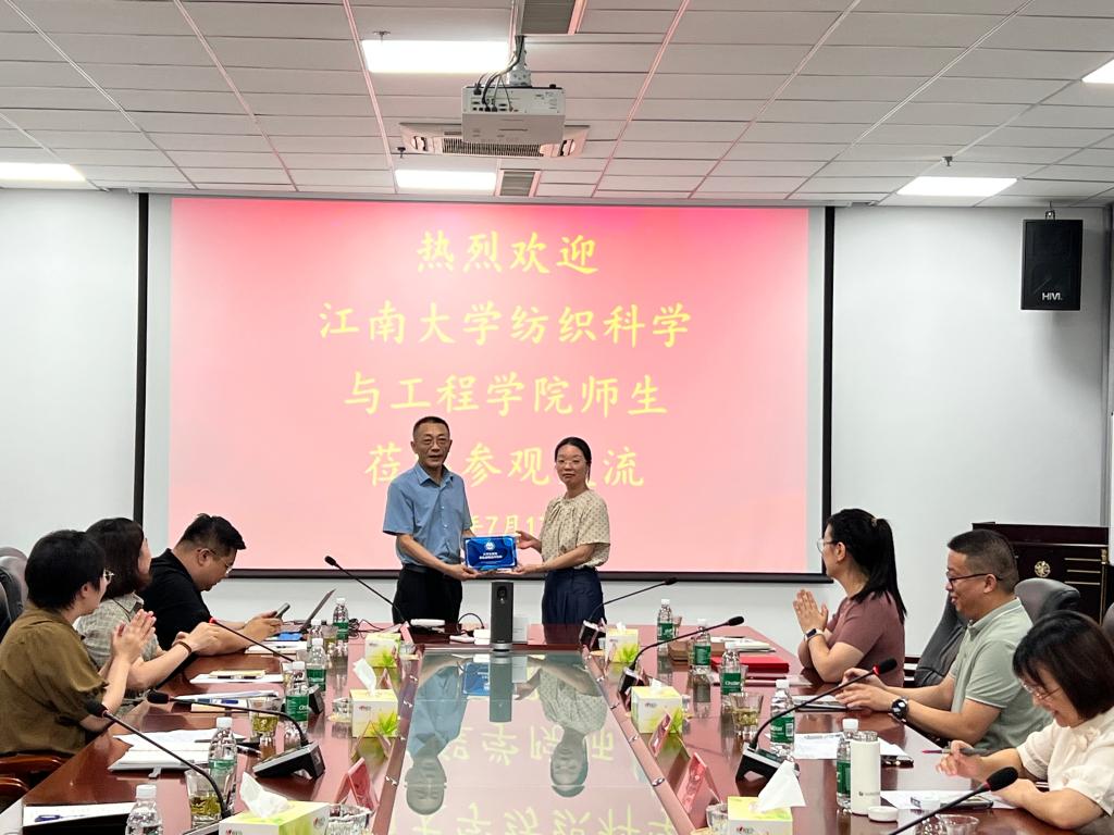 张丽平从专业学科特色、人才队伍建设、科研创新成果三个方面展开,详细介绍了学院近年来发展历程,期待持续深化合作共同培养符合行业需求的创新型、应用型人才。杨莉勤就企业人才需求做深入调研交流,期望构建校企“双向赋能”育人新格局,凝聚育人合力,着力培养纺织拔尖创新人才。最后,杨莉勤向企业颁授漫画柜