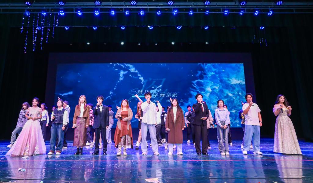 晚会以“经纬无界”为主题,分为“纵横四海,锦绣初绽”“穿梭古今,典韵新承”“织梦韶华,星河绵长”三大篇章,由学院本科生、研究生与多个校级社团联袂呈现,既有四海视野的彰显,亦有文化根脉的传承,更有青春梦想的激荡。