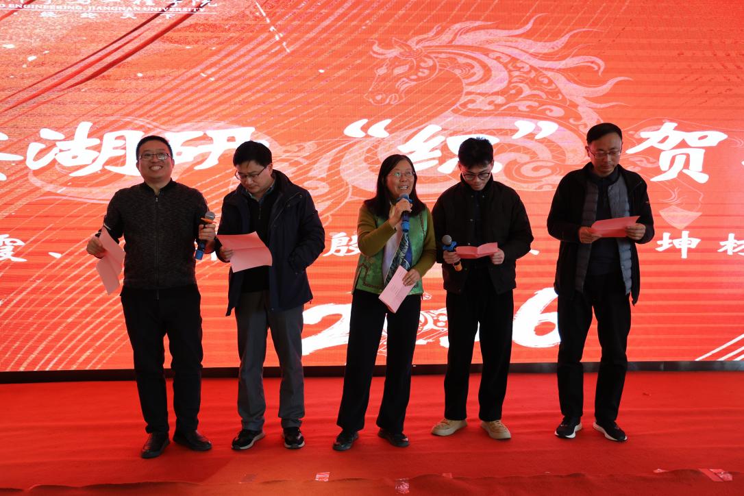 最后16支科研团队纷纷上台送出新年贺词。如“行针皆顺遂,心织俱成真;好运如线圈,环环扣锦春。”“智织经纬,驭风前行;骏马奔腾,科技迎新。”等,团队自创的三句半《蠡湖研“织”贺新春》“蠡湖冬暖柳含烟,代码织出锦万千……”,更是将学习工作与诗意巧妙相融,创意独特。现场歌舞纷呈,洋溢着欢腾与希望。
