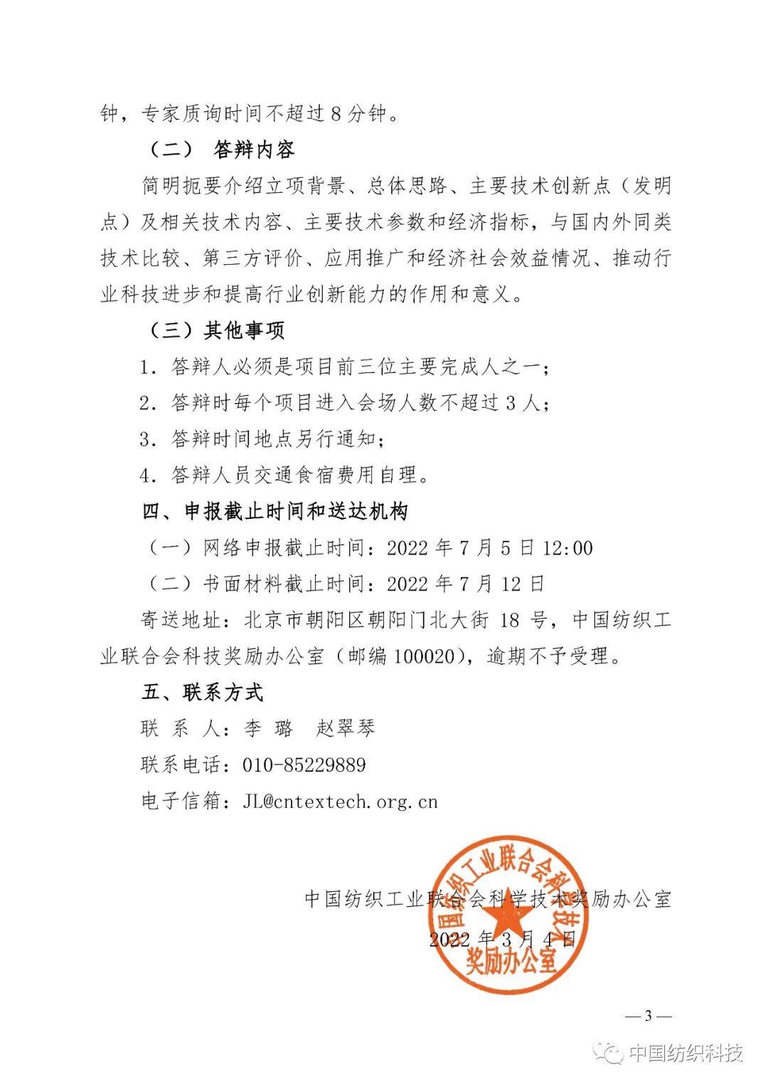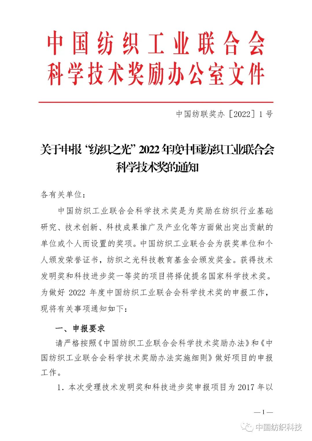 关于申报“纺织之光”2022年度中国纺织工业联合会科学技术奖的通知