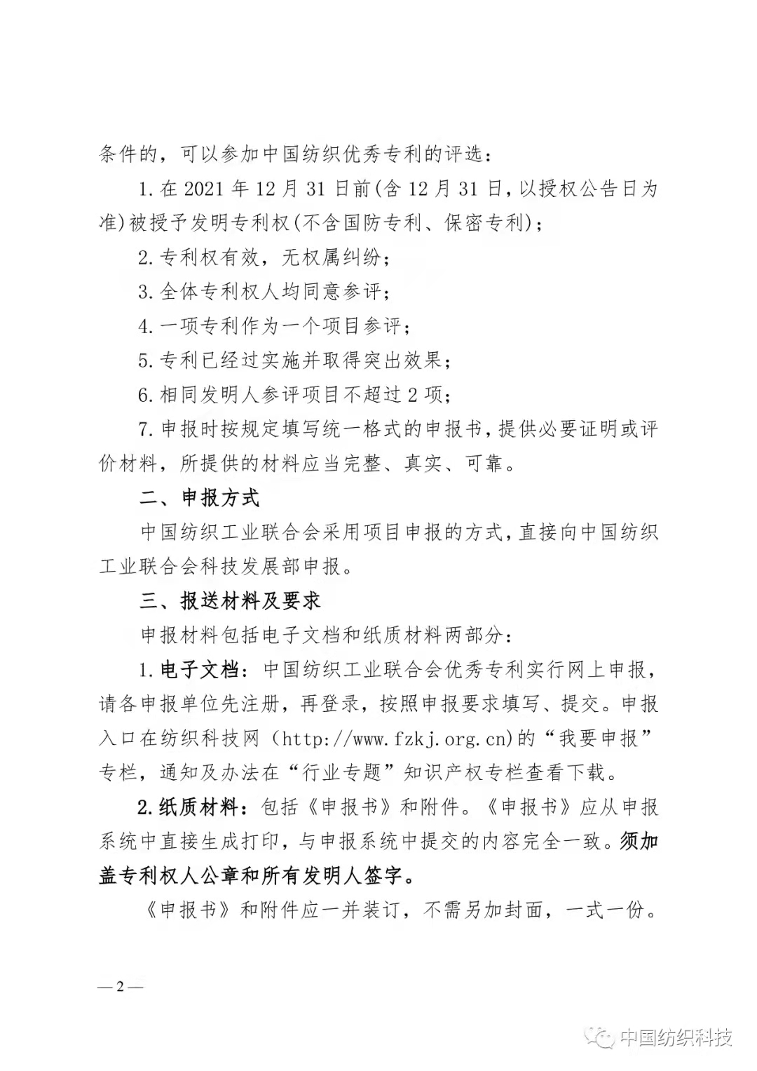 2022年度中国纺织工业联合会优秀专利申报工作已经开始,具体通知如下: