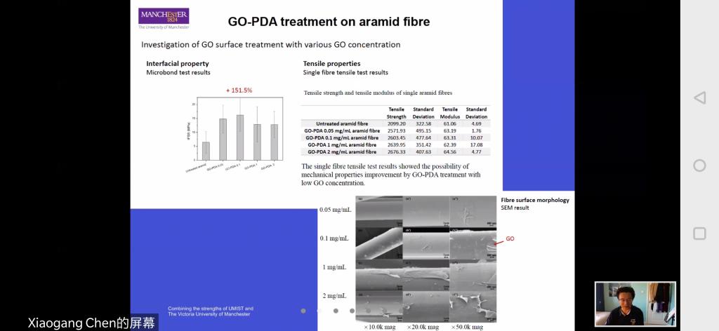 在本次讲座中,陈晓钢教授首先介绍了自己和曼彻斯特大学的有关情况,然后以军用防弹衣为切入点,介绍了防弹抗冲击纺织材料的基本要求以及自己团队目前做的一些相关研究,重点论述了纱线间摩擦力、材料连续性原则、准各向同性等理论体系的完善和强化,从纤维石墨烯改性、纱线表面处理、织物结构、杂化设计、准各向同性设计、剪切增稠液的使用等领域论述防弹抗冲击研究开发的基本问题。最后,陈晓钢教授与参会师生进行了学术交流和探讨。