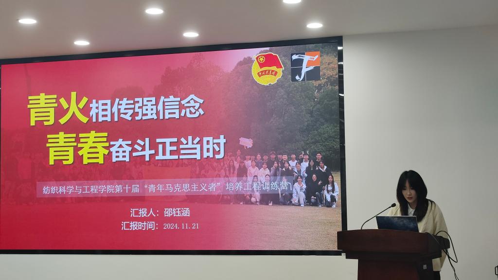 随后,“青马工程”优秀学员代表分别上台分享班团建设、学生组织的工作经验与心得感悟。2024级本科生团支书就各班级11月份的主题团日活动开展情况进行主题团课汇报,从党的创新理论、青年建功、历史文化等不同方面分别阐述了青年应如何为中国式现代化挺膺担当。轻化2103班“张闻天特称团支部”团支书赵佩煜围绕班团建设作汇报分享,希望与青马学员们共同为团支部纵深建设贡献力量。