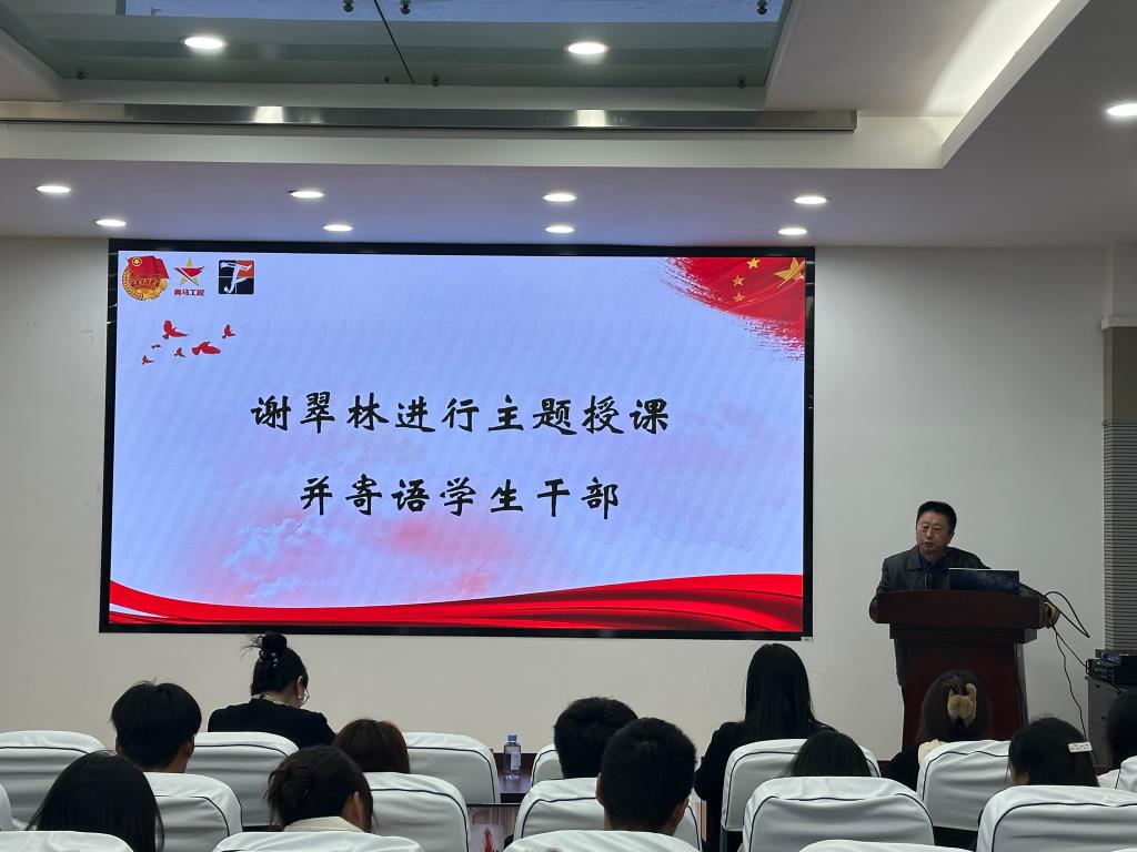 谢翠林以“党的光辉历程”为主题,结合自身经历为同学们分享了革命故事片段,并寄语新一代青年学子要注重学习、以史为鉴,争做有担当、有追求、有操守的人。任学敏介绍了特称团支部的建设背景和情况,勉励在场学生发扬特称精神,做理论学习的先行者、学风建设的表率者和团建创新的推动者。