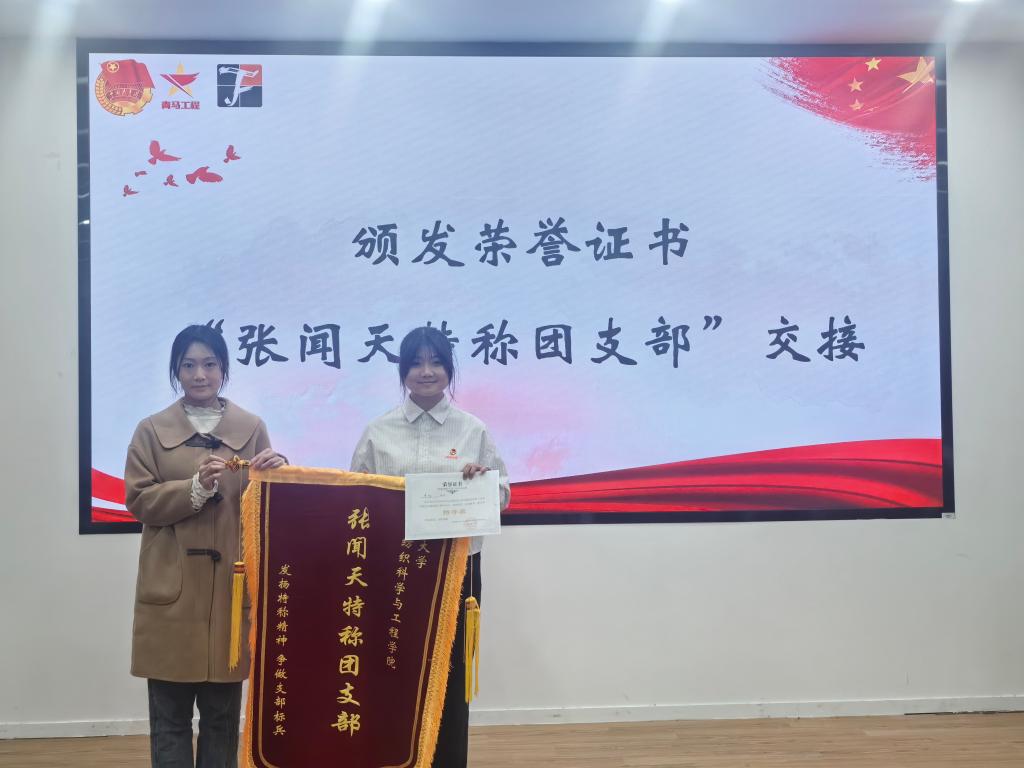 最后,任学敏公布主题团课获奖情况并颁发荣誉证书,赵佩煜与纺织2403班团支书李响进行“张闻天特称团支部”旗帜交接。